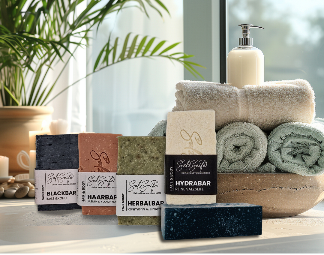 Unsere Salzseifen verbinden die tiefenreinigende Wirkung von Meersalz mit der pflegenden Kraft hochwertiger Pflanzenöle – ganz natürlich und ohne aggressive Zusätze.